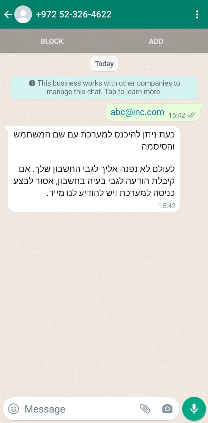 Please send whatsapp message containing your username to +972523264622 to begin authentication